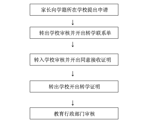 学生家长或其法定监护人向在读学校提出申请;在读学校向转入学校发出专用的《学生转学联系函》;转入学校必须经乡镇学区或联校审核同意后,才可开具同意接收回函(接收证);在读学校凭接收学校的同意接收回函及经乡镇学区或联校审核同意后,才可开具转学证明,提供学籍资料,并将有关转学资料录入计算机;转入学校凭转学证明和学籍资料接收学生。手续不完备的视为辍学生。 任何学校不得接收无转学手续的学生,也不得借故拒收已按规定程序办妥转入手续的学生。 除特殊情况外,转学一般应在学年结束至新学年开学前办理。