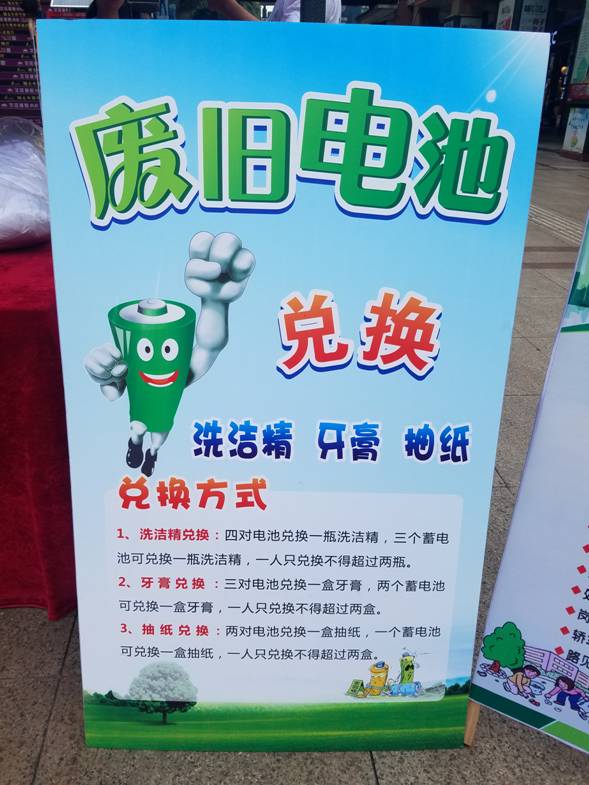 同时,在现场还开展了废旧电池换礼品的活动,四对电池就可以换一瓶洗涤精,三对电池换一盒牙膏,两对电池换一盒抽纸。过往市民踊跃参加,受到大家的热烈欢迎。