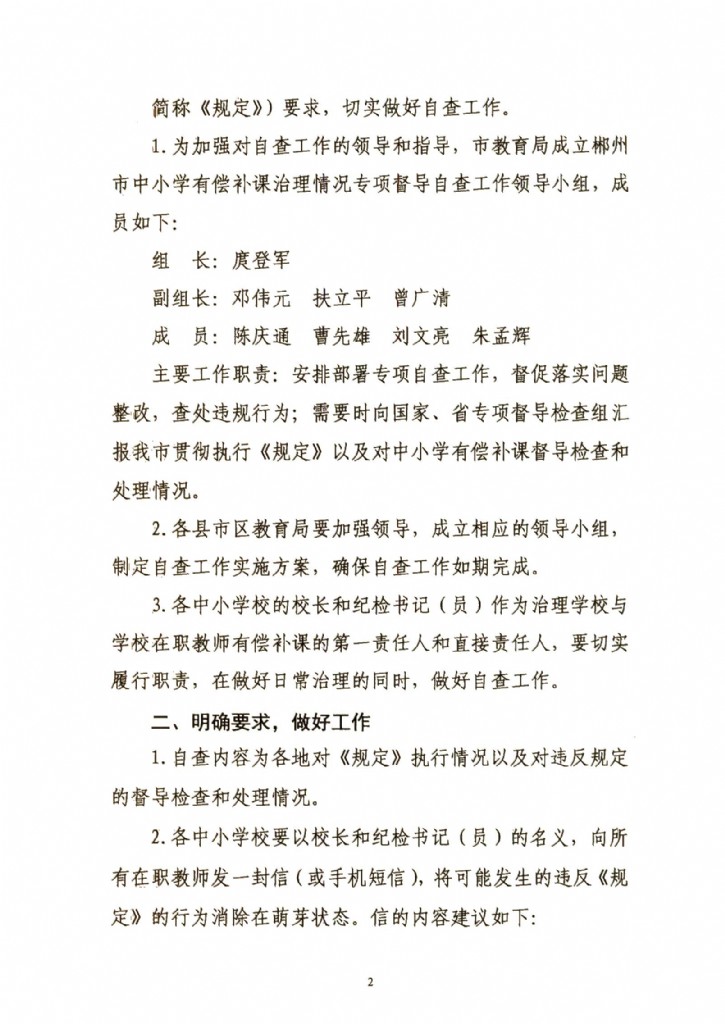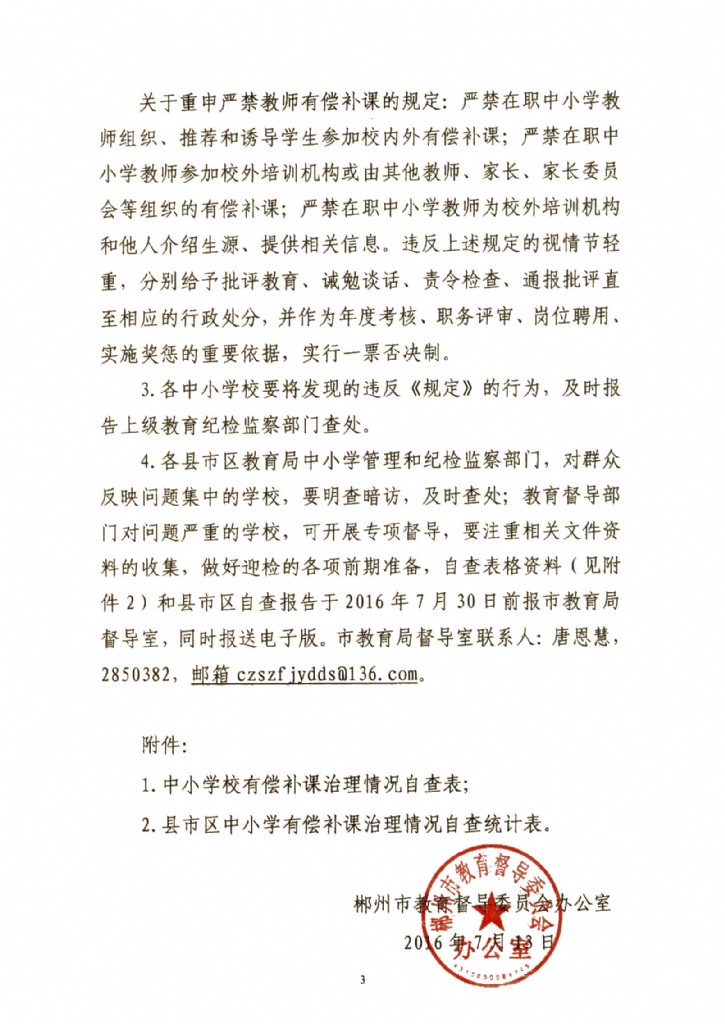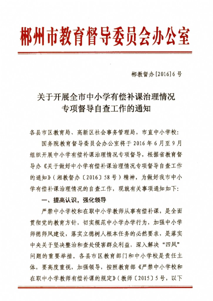 关于开展全市中小学有偿补课治理情况专项督导自查工作的通知(郴教督办【2016】6号 )